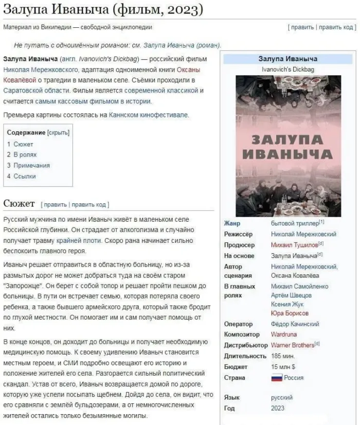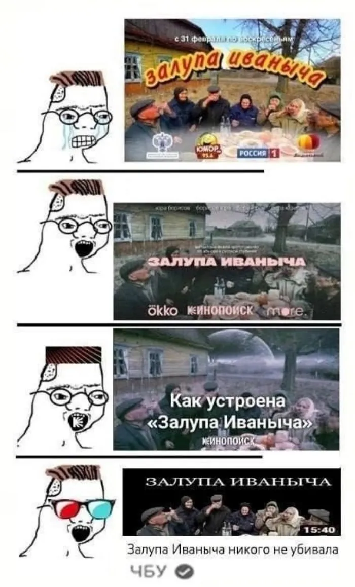 Чего бл*дь? - должен бы спросить любой вменяемый человек. И будет прав, отчасти. Несколько дней назад в одном из пабликов ВК появился мем, высмеивающий вечную тему того, что зумерам можно продавать то же говно, что и бумерам, если нарядить это в соответствующую обертку. В нём фигурирует якобы фильм под названием "Залупа Иваныча":
