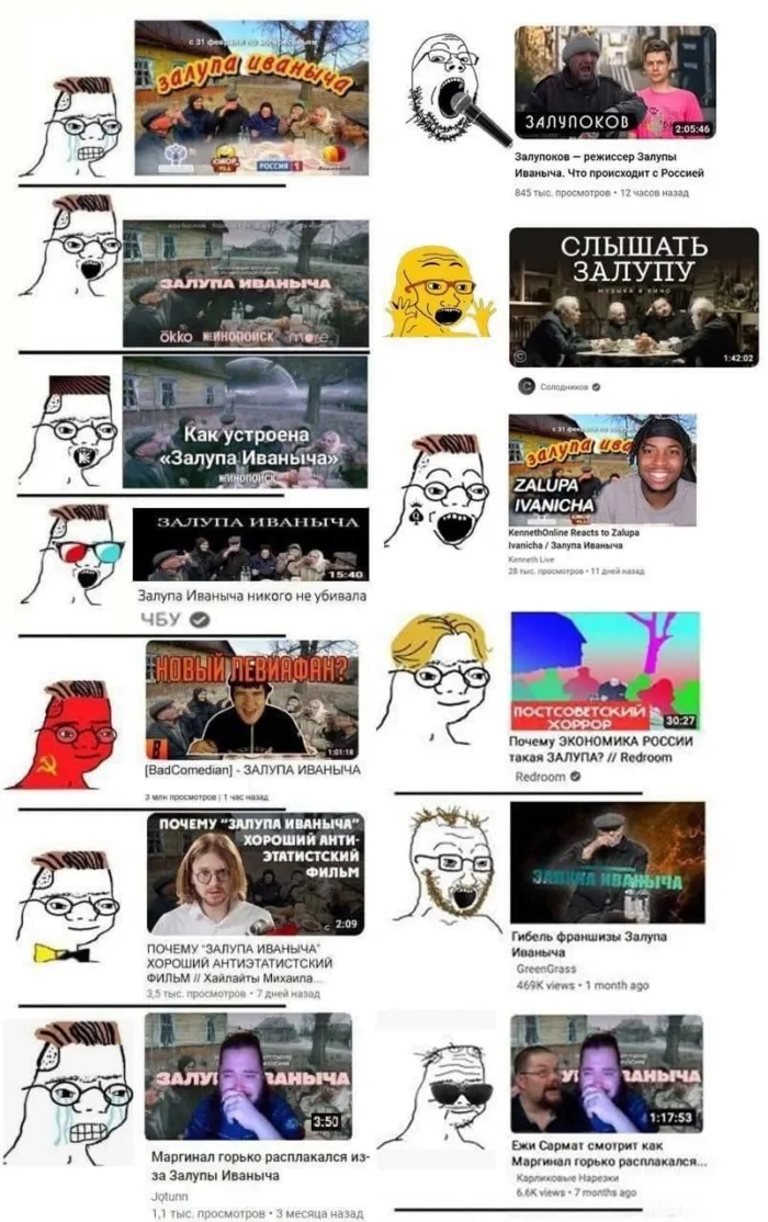 После этого мем понесли наружу в интернет, в Твиттер и ДТФ, и в рунете начался сущий кошмар. Каждый, кто хайпил на чем-нибудь хоть когда-нибудь в интернете, был обязан сделать ролик про Залупу Иваныча: