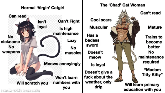 "Чад" Кошко женщина: крутые шрамы, не умеет читать, мускулистая, взрослая, у неё крутой меч, тренируется что бы быть лучше, не мяукает, не требует особого ухода, верная, по*бать на погоду, "Мадам Сися Кися", будет с тобой получать начальное образование