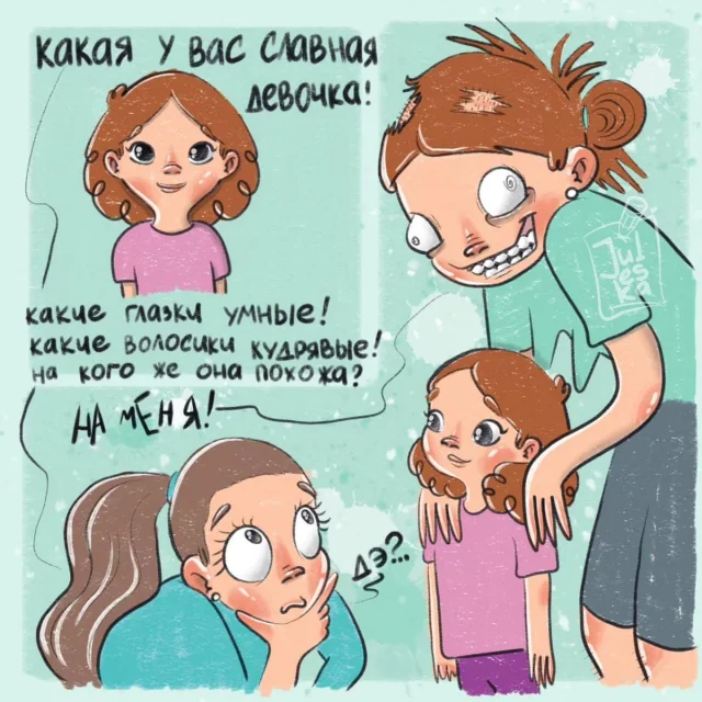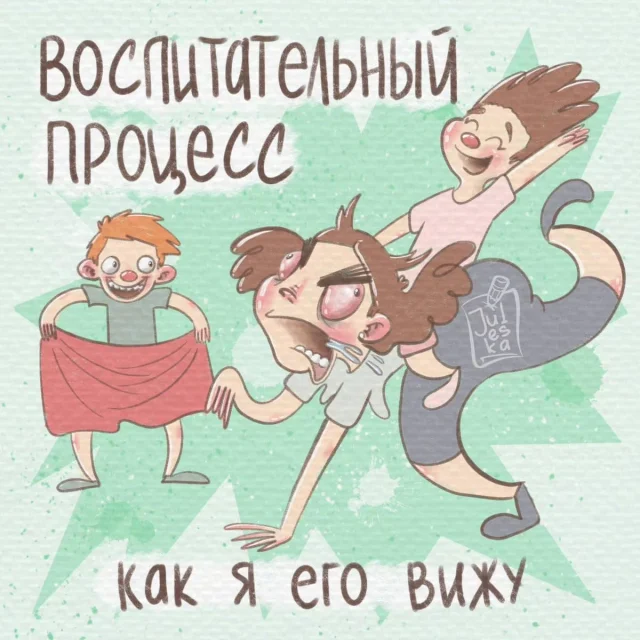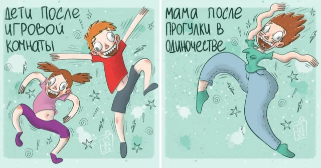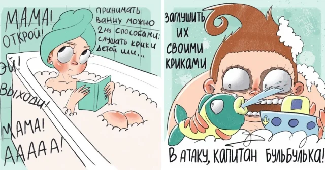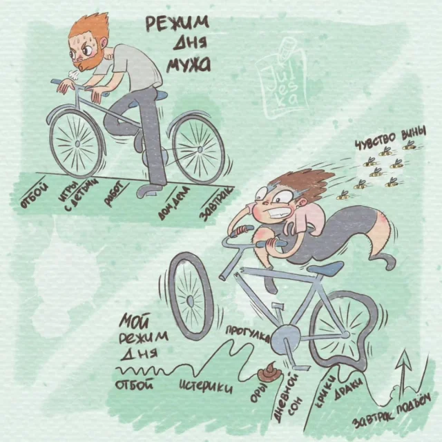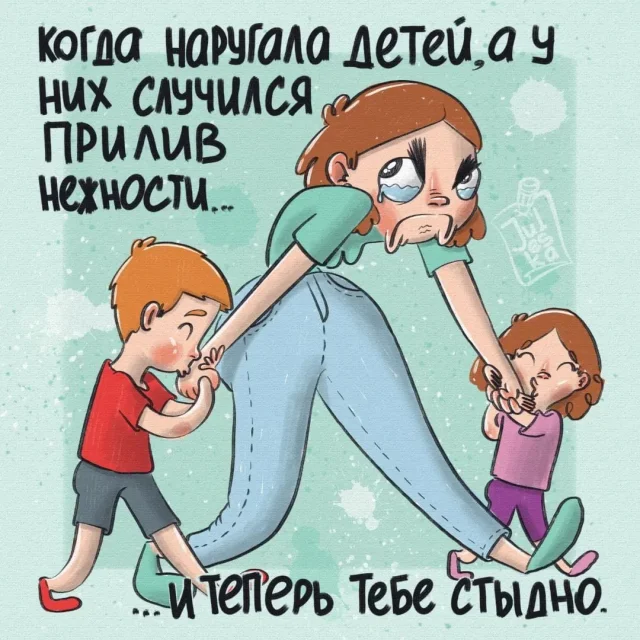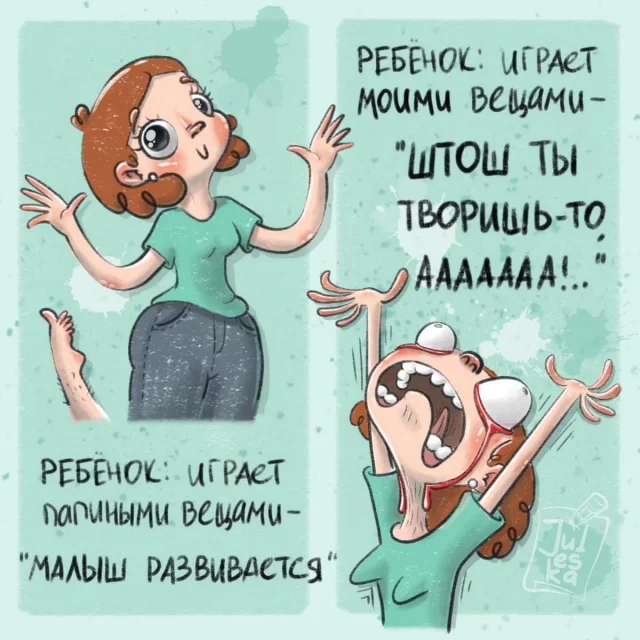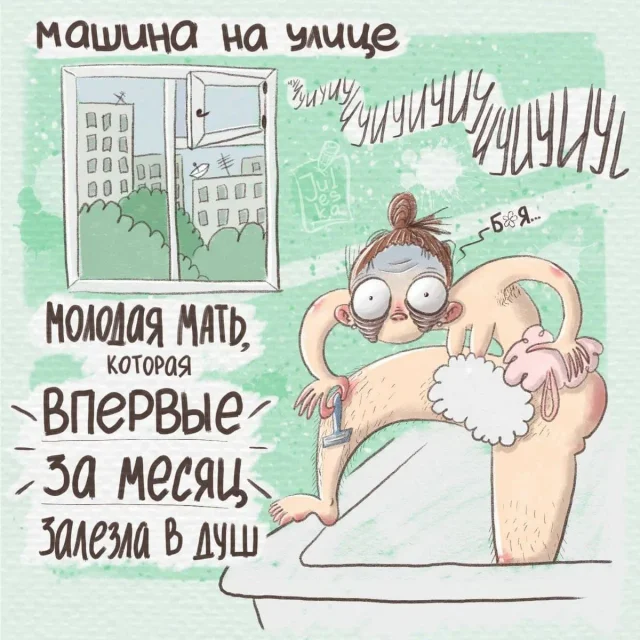 Многие художницы изображают родительство, как нечто чудесное и сказочное, словно их жизнь диснеевский мультфильм. Нет, детишки, безусловно, наша главная радость. Но реальность, все-таки, разительно отличается от фантазий. И художница Юлия из Оренбурга абсолютно не стесняется показывать родительство во всей своей красе. Будучи молодой мамой, она знает, о чем рисует.