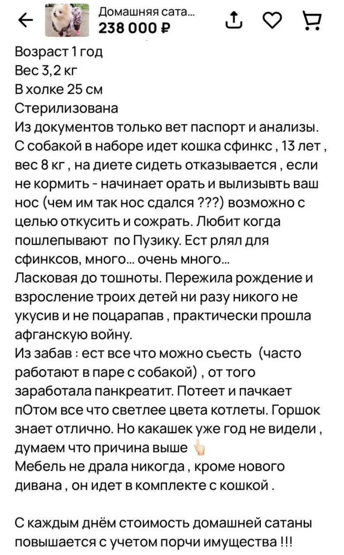 Белоснежный неприхотливый комочек счастья украсит собой любую квартиру и подарит незабываемые эмоции новым владельцам, бонусом к домашней сатане идет пожилая кошка-сфинкс. Эта парочка, по заверениям хозяина гарантированно избавит от скуки кого угодно.