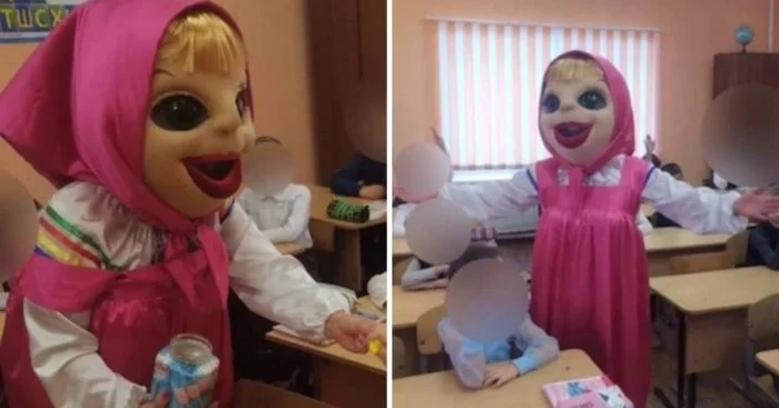 Эта Маша курильщика поздравляла детишек в школе Кемеровской области. Надеемся, что из баночки она раздаёт купоны на скидку к психотерапевту 🙂