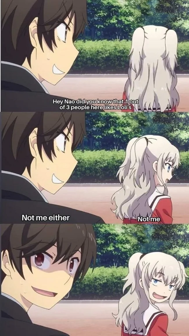 - Эй Нао, а ты знала что одному человеку из трёх нравятся лоли? Мне вот нет.