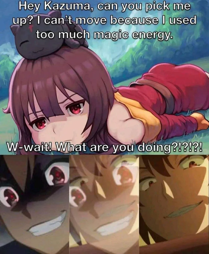 Эй Казума, может понести меня? Я использовала слишком много маны и теперь не могу двигаться.