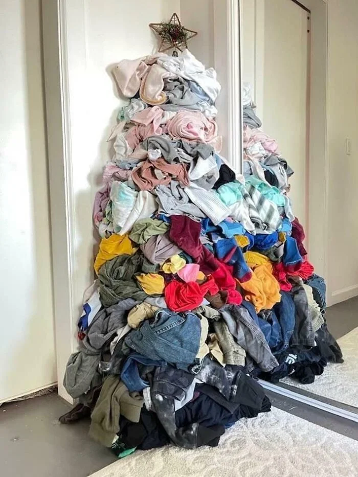Ёлка из одежды, которую надо постирать.