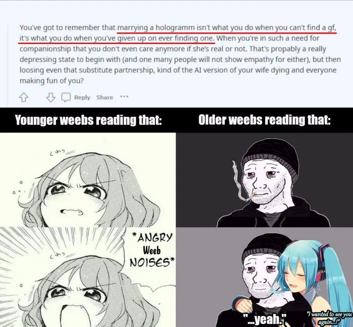 Ты должен запомнить что женитьба на голограмме это не то что ты делаешь когда не можешь найти девушку, а то что ты делаешь когда уже разочаровался в возможности когда-либо её найти