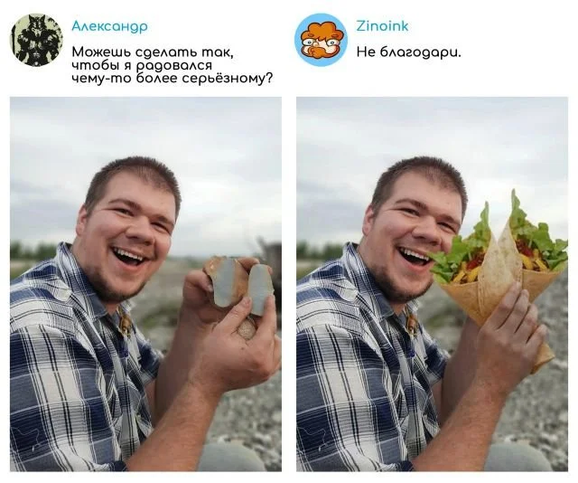 Далеко не все умеют пользоваться фотошопом. Да, теперь есть удобные фоторедакторы в каждом смартфоне, но инструментарий там весьма ограничен. Но если среди знакомых есть фотошоп-умелец, то можно обратиться к нему за подмогой. Но коль таковых нет, то не печальтесь. На помощь всегда придет Zinoink. Он бесплатно исправит ваш снимок. Но... будьте аккуратны со своими пожеланиями!