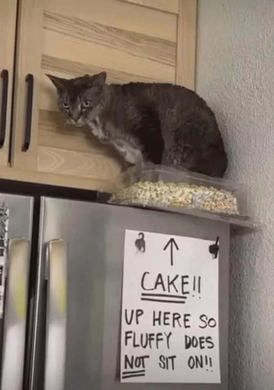 Надпись на холодильнике: «Торт!! Наверху, поэтому Пушистик не должен там сидеть»