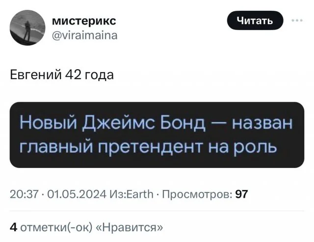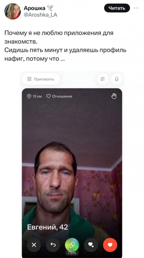 Соцсети обсуждают некоего мужчину по имени Евгений, которому 42 года. Все началось с того, что одна из пользовательниц, ищущая любовь на сайте знакомств, увидела его фото и написала: «Сидишь пять минут и удаляешь профиль нафиг, потому что...». Пользователям это не понравилось и они начали помещать его на обложки журналов, и искать ему пару. Кстати, выяснилось, что он работает на бетономешалке и ему 50 лет.