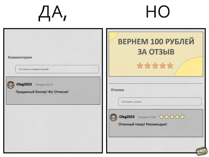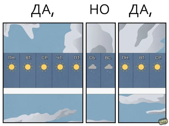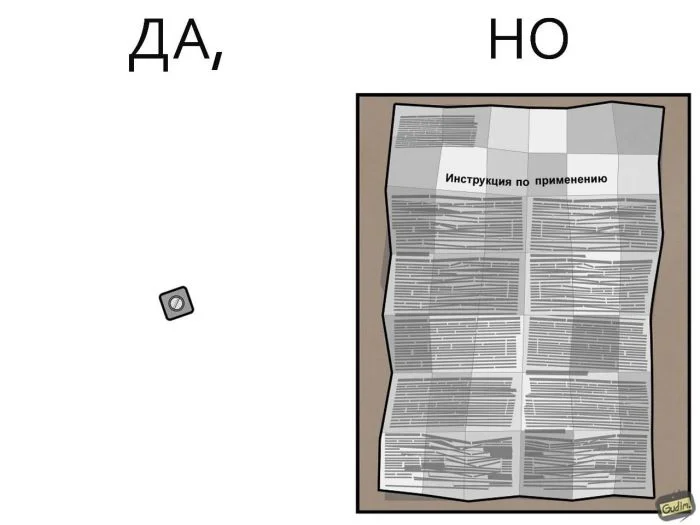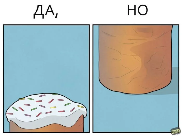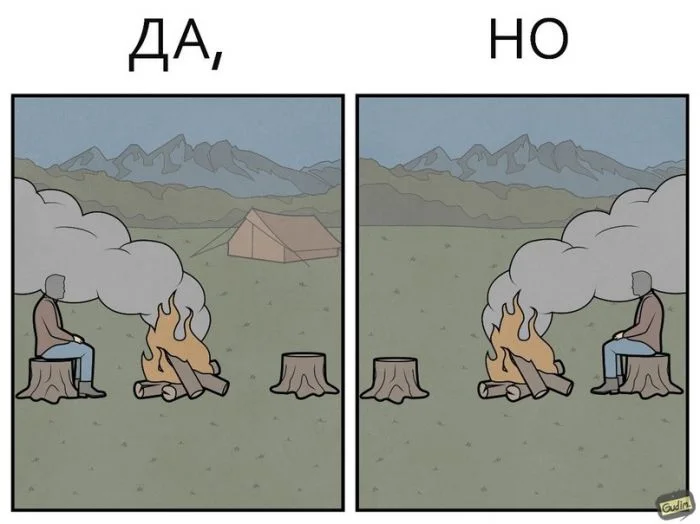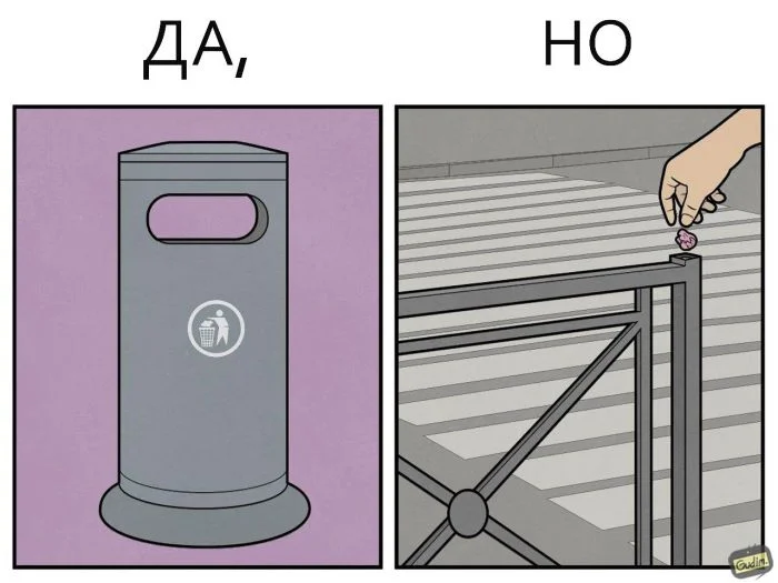 Да, Но — двухпанельный веб-комикс, который в минималистичной манере разоблачает нелепости и лицемерие повседневной жизни, созданный художником Gudim. Новая порция картинок со сравнениями в этом посте.