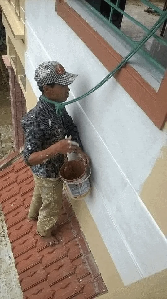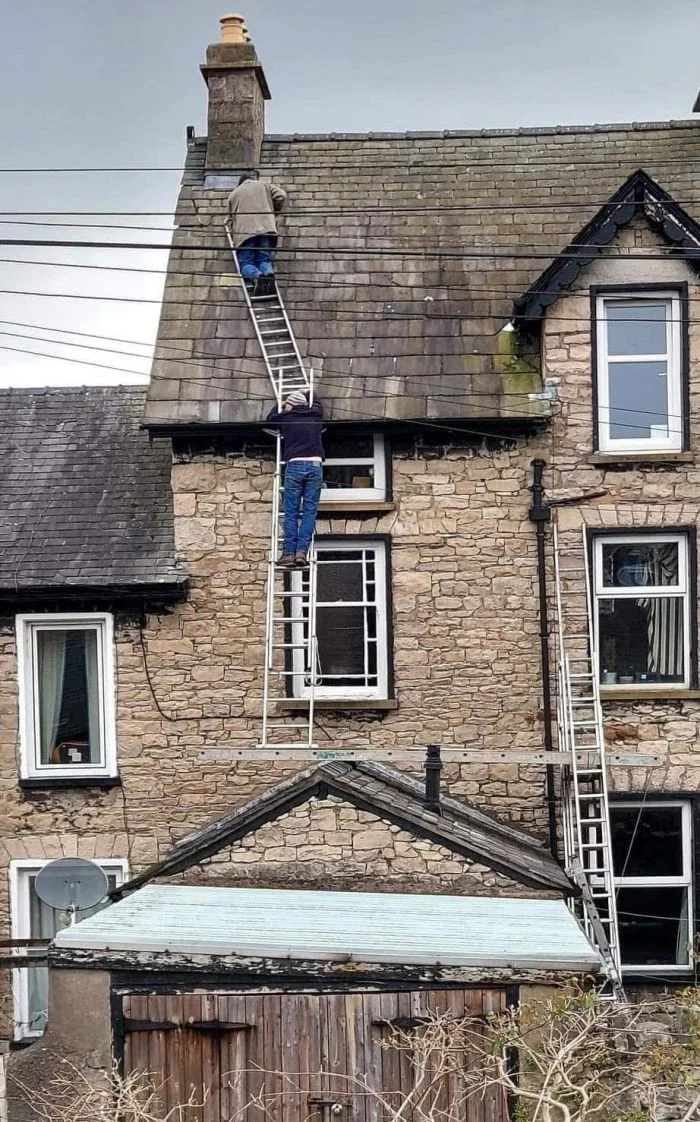 Вместо устойчивой лестницы или какой-нибудь подставки строители решили использовать мусорный контейнер.