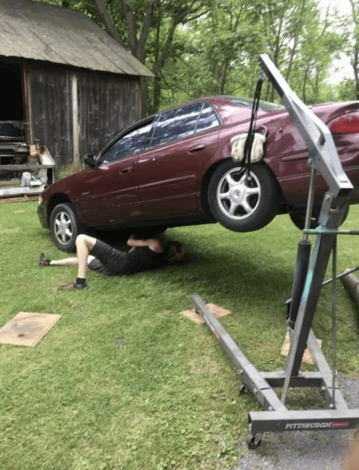 Меня поражает то, что парень подложил подушку между тросами и автомобилем, чтобы избежать повреждений. Но мысли о защите почему-то не распространились на него самого.