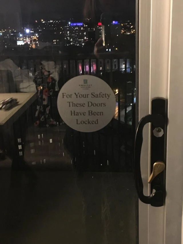 Надпись: «Для вашей безопасности эти двери заблокированы».