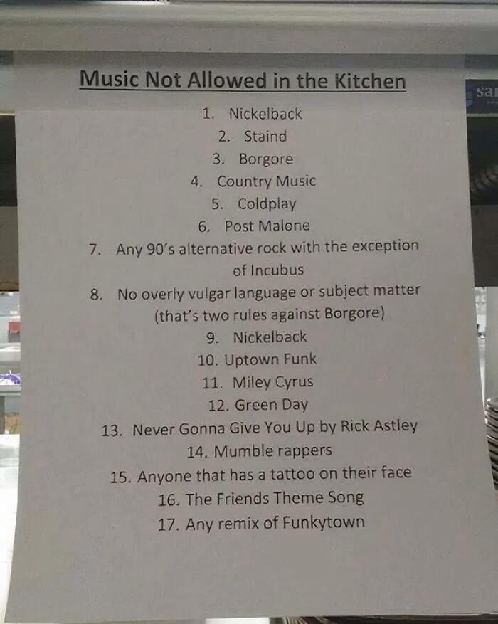 13. «Музыка, запрещенная на кухне». Nickelback упомянут дважды! Запрещены рэперы, исполнители с тату на лице, тема из сериала «Друзья», главный хит Рика Эстли, альтернативный рок 90-х и другие