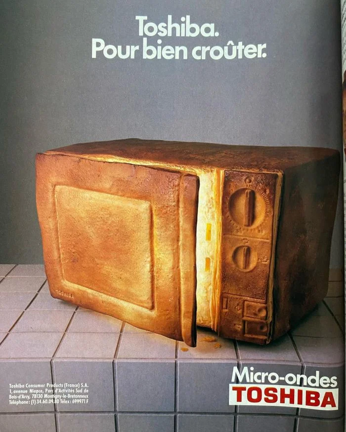 Это винтажная реклама микроволновых печей марки Toshiba. Кажется, после такого маркетинга продажи техники бренда пошли в гору!