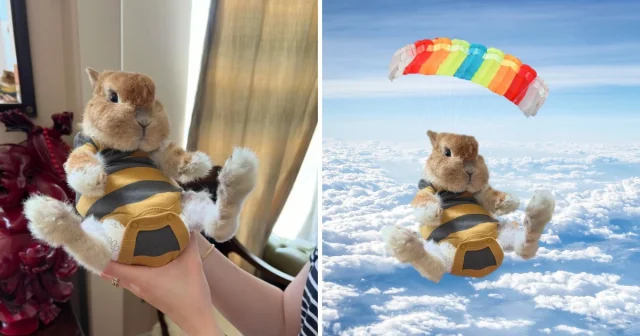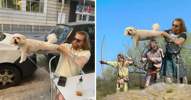 Хозяйка надевает пакеты на свою собаку, чтобы та не вымокла во время прогулки под дождём