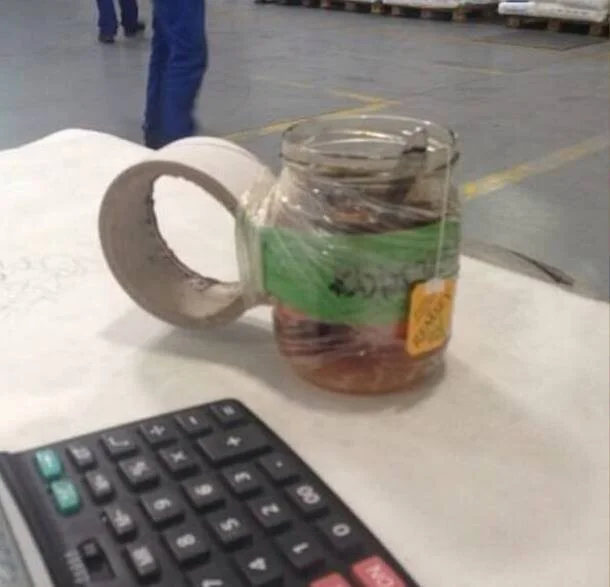 Не оказалось кружки под рукой? Не беда! Берём любую банку и самый обычный скотч. И лёгким движением руки, банка превращается в кружку.
