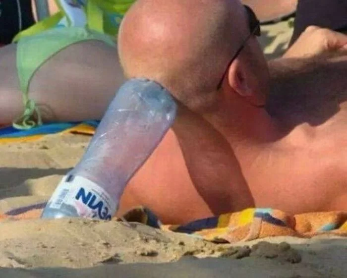 Если у вас на пляже затекла шея и неудобно лежать на песке, вот вам выход из этой ситуации. Ведь бутылка берётся на пляж всегда. Дёшево и сердито, а главное практично.