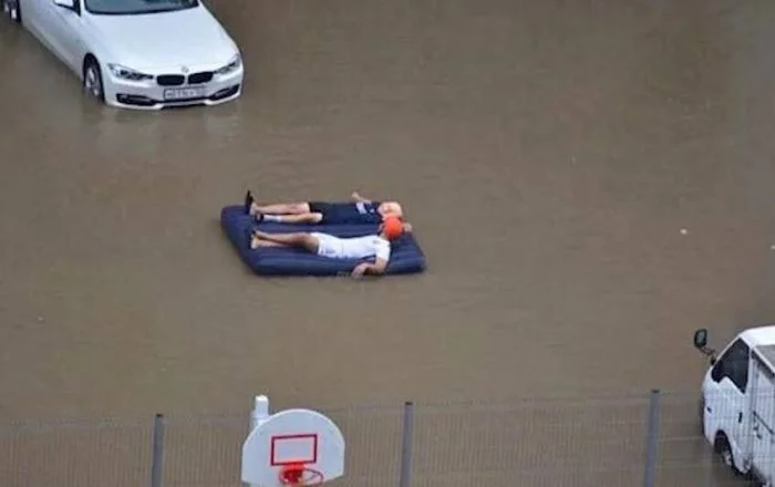 В городе потоп, все кругом суетятся и паникуют? Зачем нам всё это? Берём надуваем матрас и отправляемся в плавание по городу. У нас теперь есть своя Венеция.