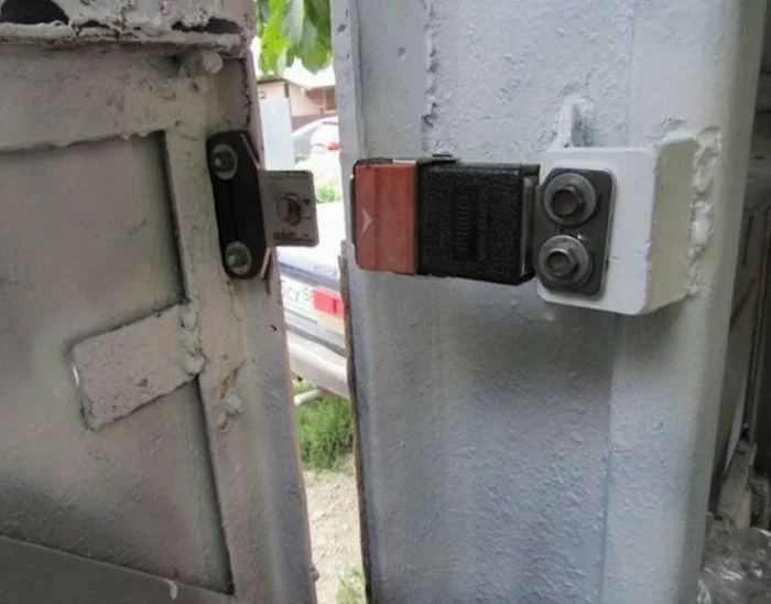 А вы знали, что крепление для ремня, это отличная замена для дверной щеколды? А ведь действительно удобно. Почему не сделать подобные замки и не продавать для бытовых нужд?