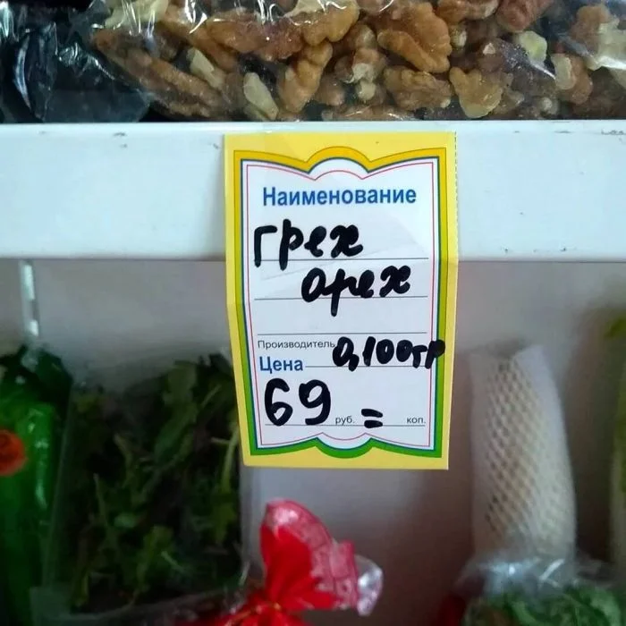 Возможно, продавцы имели в виду, что грецкий орех грех ни купить и не съесть. Так как он как Адамово яблоко, очень вкусный и волшебный.