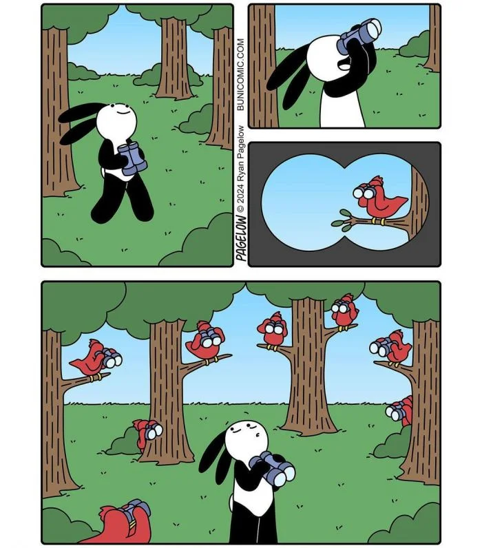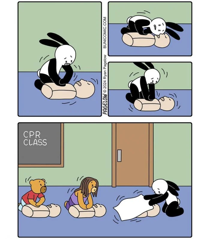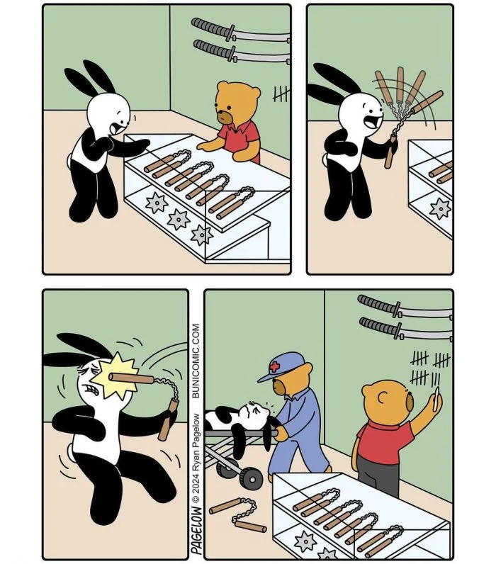 Райан создатель комиксов про чёрно-белого кролика Банни. За творчеством художника следят почти 700 000 подписчиков. Помимо зарисовок про будни ушастого, он также креативит и с другими персонажами. В этой подборке вы найдёте забавные ситуации с участием животных, сосисок и даже мыла. Приятного просмотра!