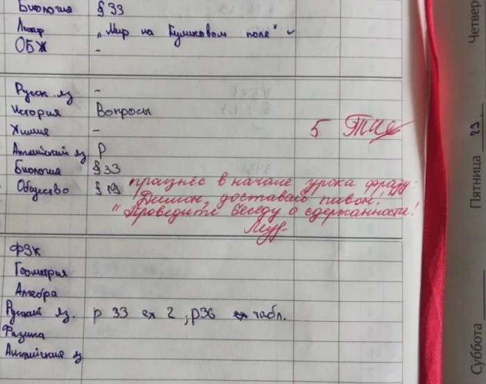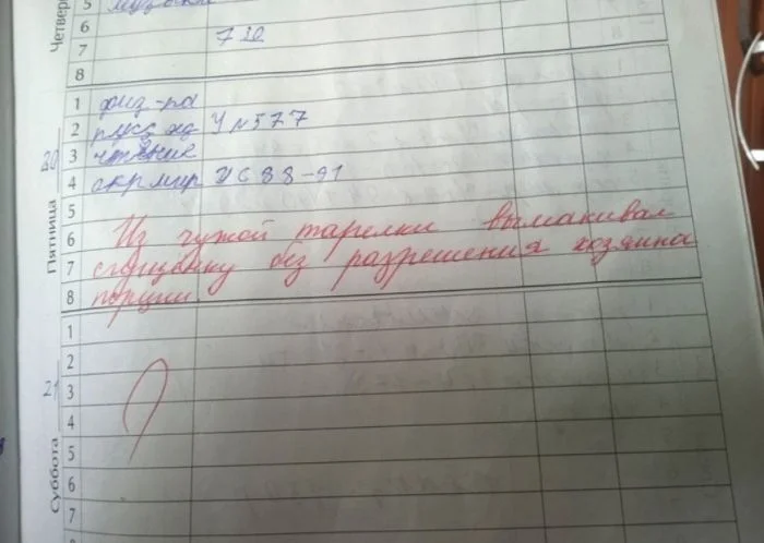 Племянник заработал пятерку на литературе и тут же подрался с одноклассником. Теперь в дневнике красуется вот такая надпись.