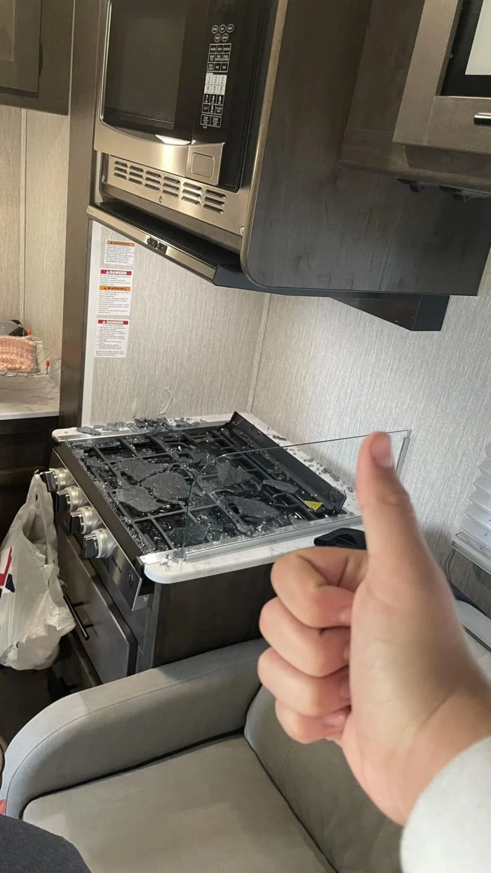 Это была закалённая стеклянная крышка, которая складывается над плитой. Она даёт больше места на столешнице, когда вы не пользуетесь плитой.