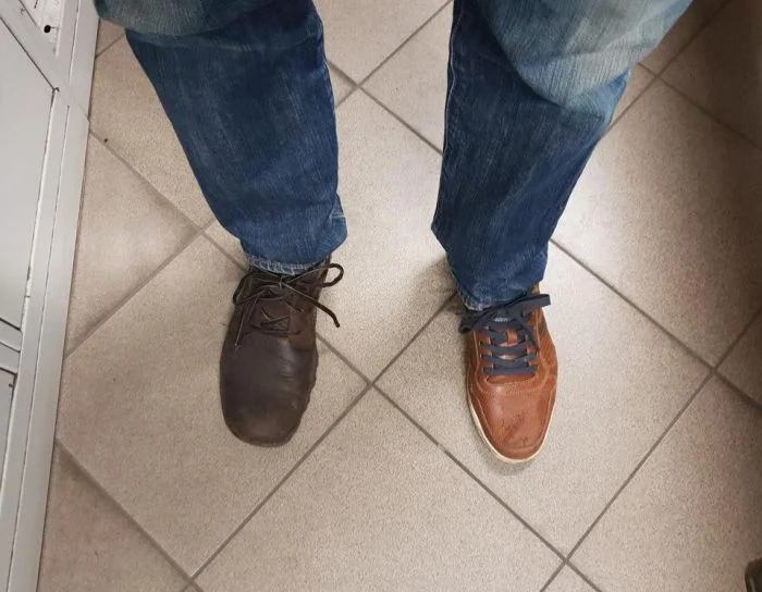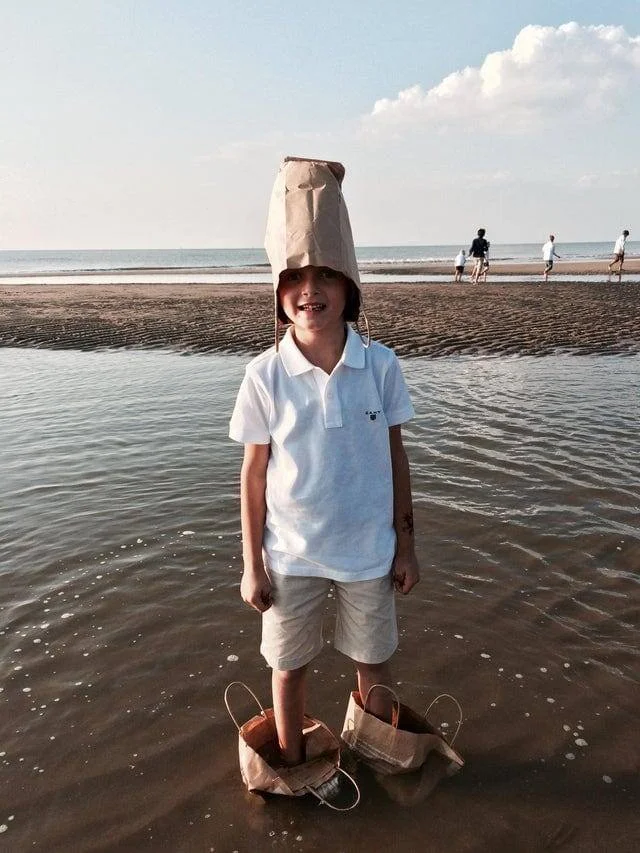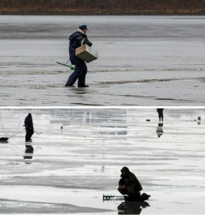 Он не хотел, чтобы его обувь промокла, поэтому он надел бумажные пакеты на ноги и зашёл в воду