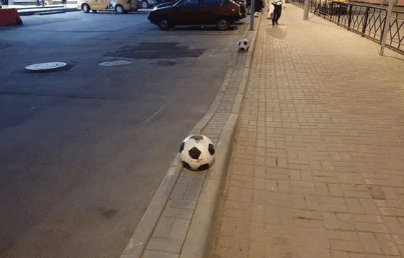 Инновации в украшении района: бетонные сферы покрашены под футбольные мячи