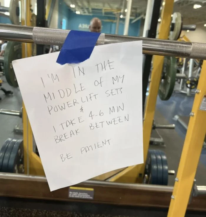 18. «Объявление в зале во время пикового времени: "Я выполняю силовой комплекс с перерывами в 4–6 минут между подходами, пожалуйста, будьте терпеливы"».