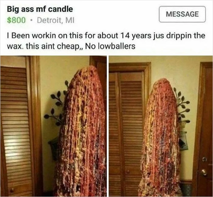 28. "Ох**нительно большая свечка, 800 долларов. Собирал ее из воска 14 лет, дешево не отдам"
