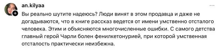 Когда интеллект Чарли начинает расти, его язык становится точным и ясным, отражая глубину и сложность его мыслей. Но вместе с этим приходит осознание жестокости и предательства, которые он раньше не мог понять. Роман задает важные вопросы о цене интеллекта и истинной природе счастья. Ведь, обретя разум, Чарли теряет простоту и невинность, испытывает одиночество и отчаяние, столкнувшись с реальностью, которую ранее не замечал. Его трагическая история напоминает нам, что интеллекта и знаний недостаточно для обретения счастья, и что каждый человек, независимо от уровня интеллекта, достоин уважения и любви.