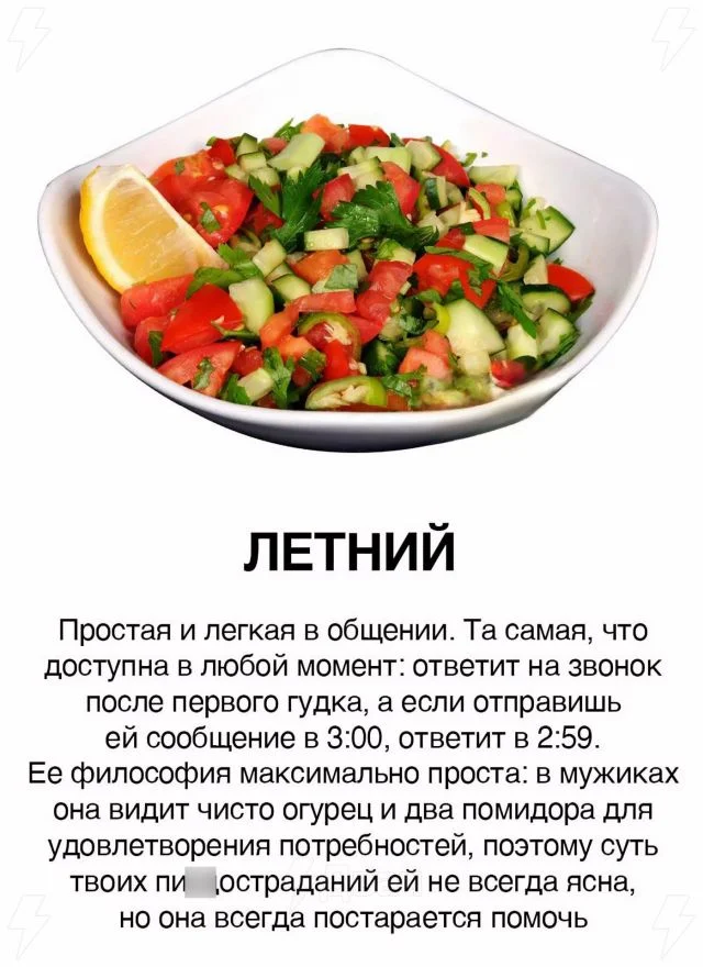 Ну что ж, мы уже поглядели сравнения парней с кофе и смартфонами. В этот раз девушка решила немного изменить вектор. Теперь она придумала "типологию" подруг и сравнила их с салатами. Получилось... весьма правдоподобно.