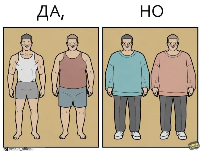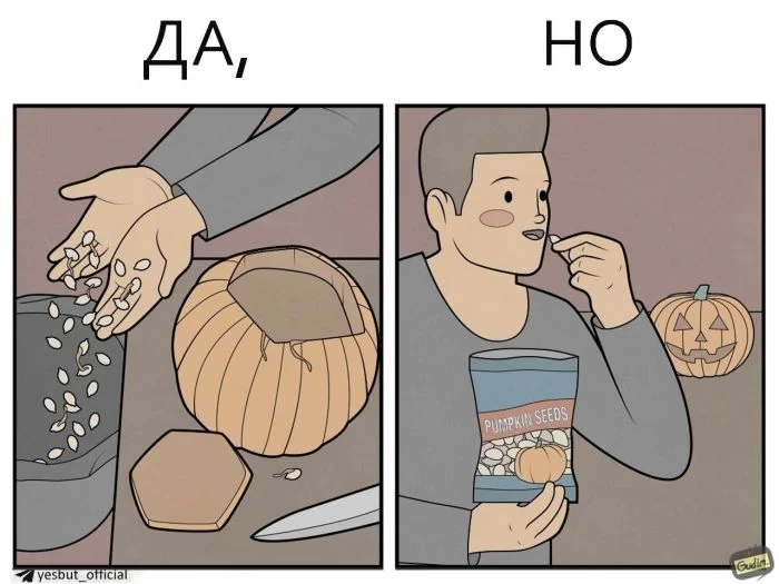 "Да, Но" - серия комиксов от автора Гудим, который показывает, что у реальности есть две стороны. Посмотреть на одну и ту же ситуацию всегда можно с разных ракурсов. Даже обычный поход в магазин или покупка наушников могут таить в себе то самое "Но".