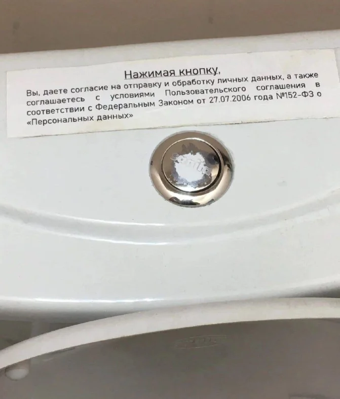 Кто-то решил поиграть с правилами корпоративного этикета, разместив соглашение на обработку персональных данных прямо на крышке унитаза. Ну разве не креатив?