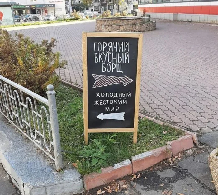 Хозяин этого заведения явно знает, что согревает душу. Ведь, оказавшись перед выбором между холодным миром и горячей тарелкой борща, мало кто устоит.