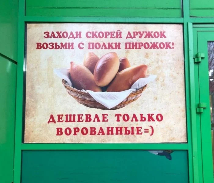 Наши люди ценят юмор с оттенком сарказма. Надпись про пирожки на полке выглядит особенно "по-русски" — дешево, вкусно и немного дерзко.