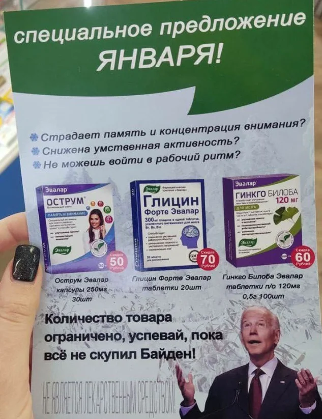 Как убедить россиян купить витамины? Угрозой, что Байден всё раскупит! Маркетинговые гении, не иначе.