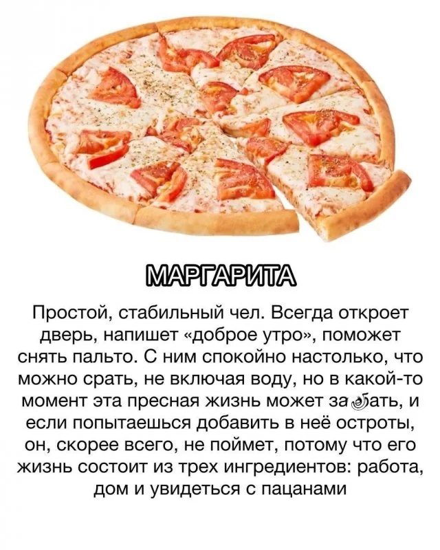 Девушки с просторов соцсете продолжают сочинять небанальные и забавные исследования отношений. Например, в этот раз они сравнили парней с пиццей. Ну, что, девочки, есть совпадения?