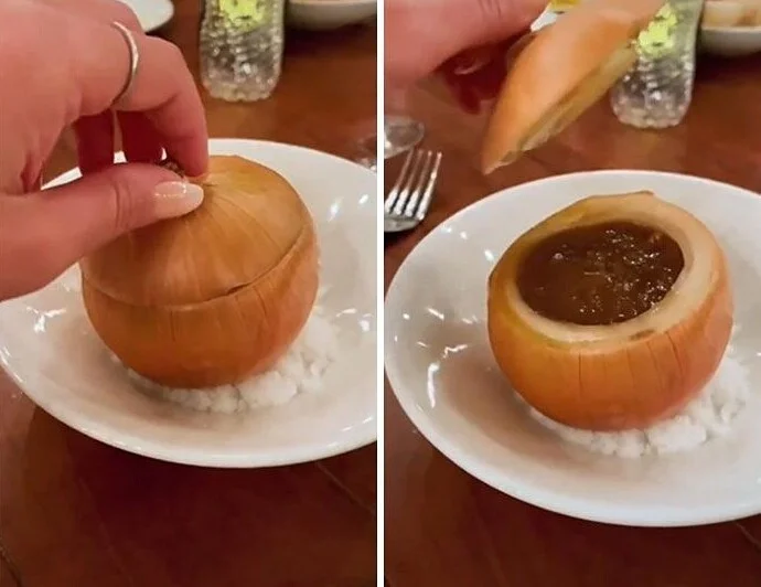 7. Луковый суп, поданный прямо в луковице, которая никак не хочет оставаться на месте.