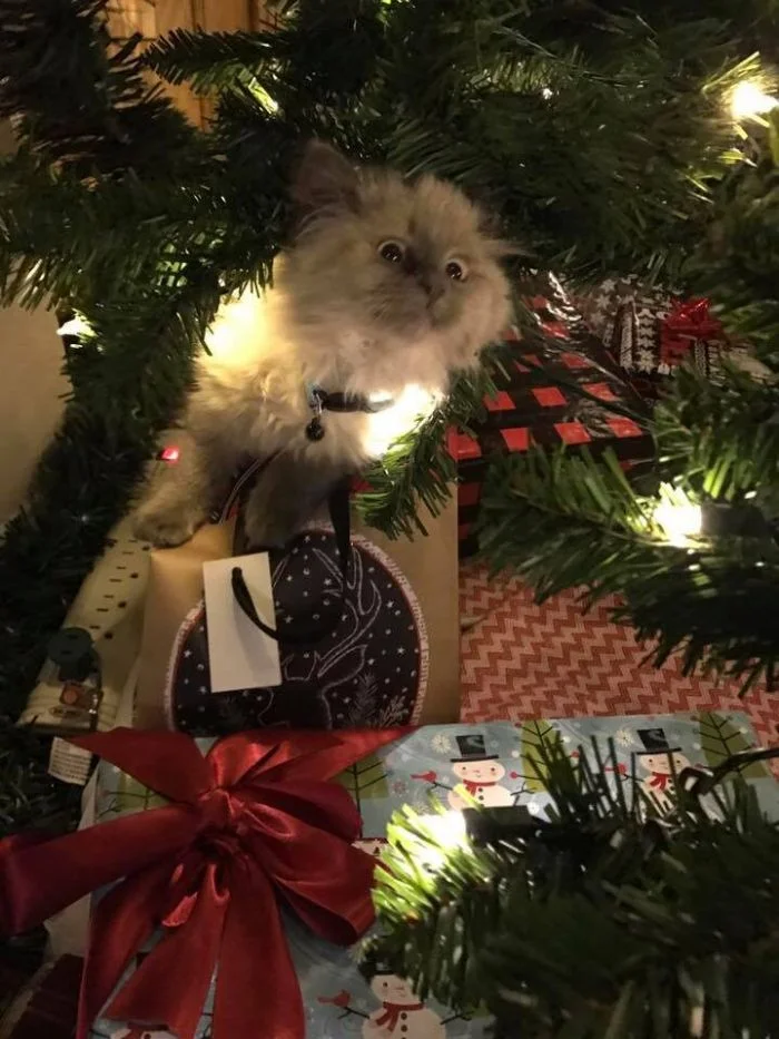 6. Кошка залезла на ёлку, свалилась с неё и упала прямо в подарочный пакет