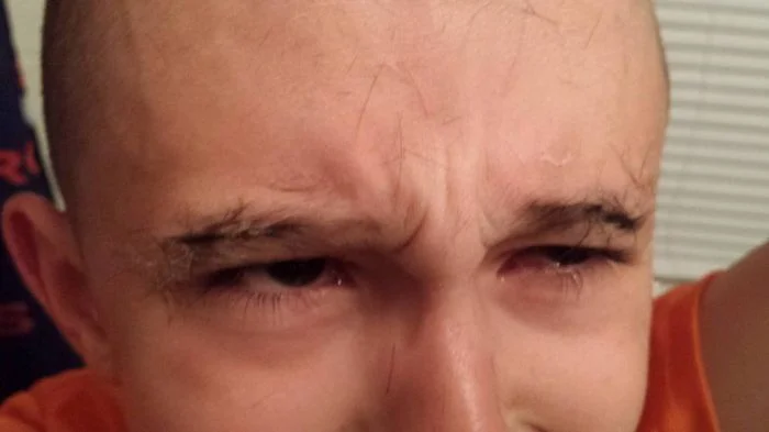 Мой сын решил подстричь себе брови. Получилось слишком коротко, поэтому он срезал волосы с головы и приклеил их на брови. И тут же понял, что так делать не стоило.