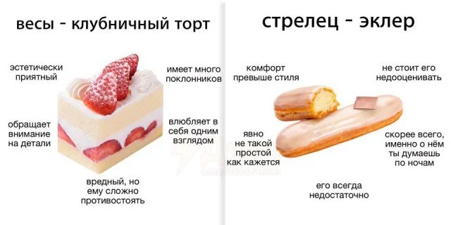 Итак, представляем вам свежие результаты исследования, проведенного усердными астрологами, которые каждую ночь наблюдают за небесными светилами. На этот раз они определили, какой торт соответствует вашему знаку зодиака. Обязательно проверьте, соответствует ли это вам. Это действительно важно...
