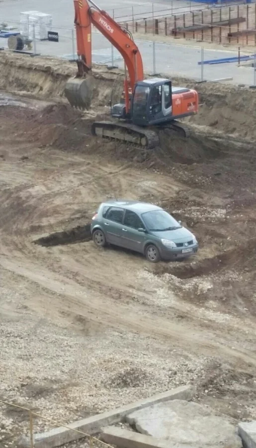 На этом участке ведутся строительные работы по созданию новой дороги. Накануне кто-то оставил здесь свой автомобиль. Экскаватор долго сигналил, но никто не отреагировал. В итоге последовало неожиданное решение.