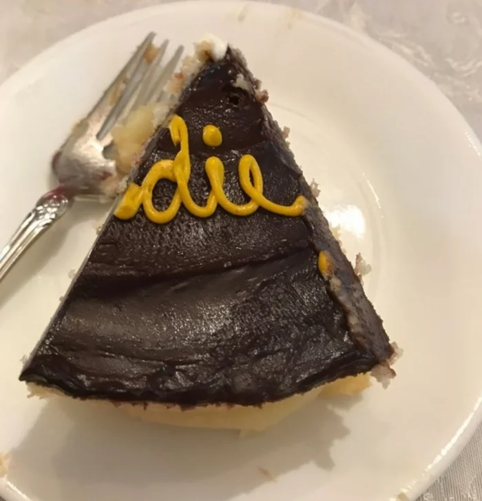 4. Теща передала зятю кусочек торта с остатком надписи «die» (сдохни).