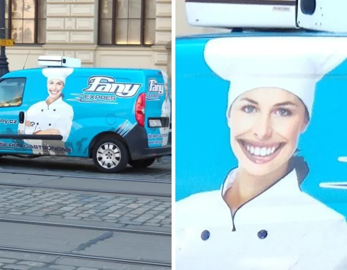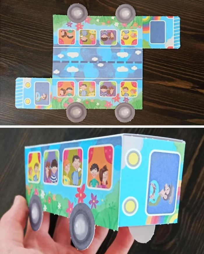 4. Передняя часть автобуса повернута, но почему на крыше изображены дорога и облака?