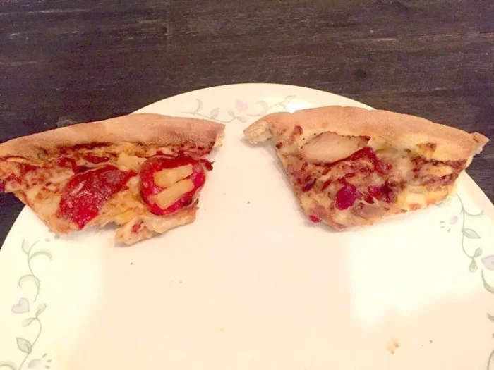 Попросила разрезать два кусочка пиццы пополам. Муж сделал это абсолютно серьёзно