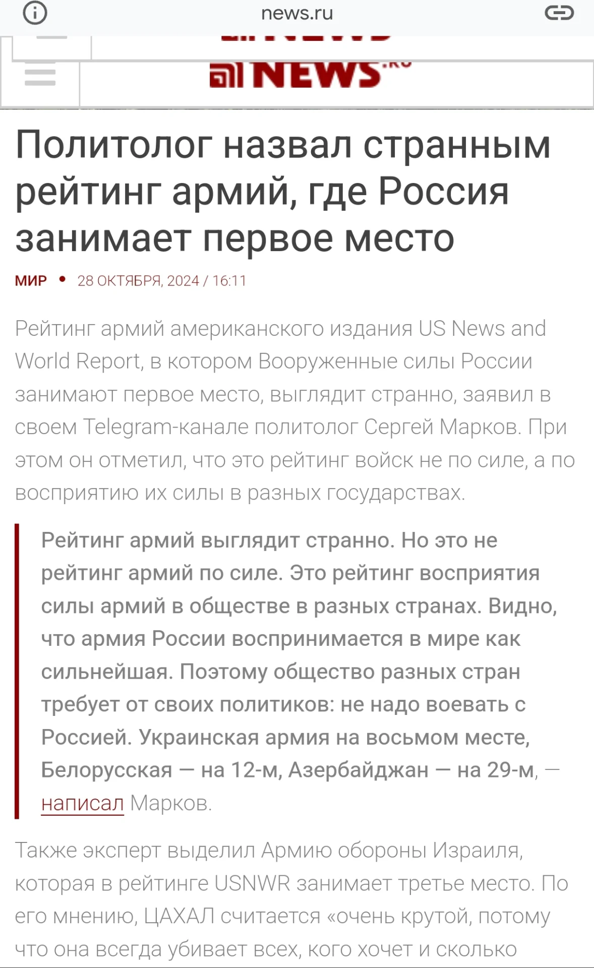 Исследование от U.S. News and World Report предоставило рейтинг стран по различным критериям. Согласно данным экспертов, Россия лидирует в мировом рейтинге по мощи вооруженных сил, опережая США, которые оказались на второй позиции, и Израиль, занявший третье место. В публикации подчеркивается, что Россия — крупнейшее государство по территории, однако в её адрес высказываются обвинения в вмешательстве в американские выборы и осуждение за "нарушение прав человека", что в частности касается прав сексуальных меньшинств.