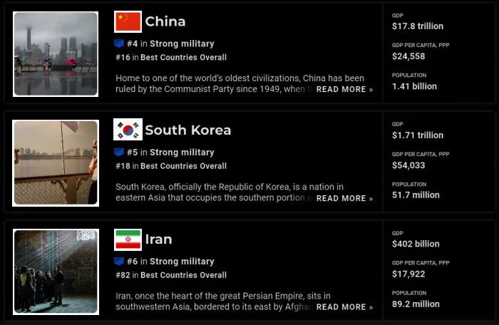 На четвертом месте оказался Китай, описанный как "колыбель цивилизации". Пятую строчку заняла Южная Корея, а шестую — Иран. Важно отметить, что в общем рейтинге, охватывающем широкий спектр критериев, США, Китай и Южная Корея опередили Россию, оставив её на 36 месте.